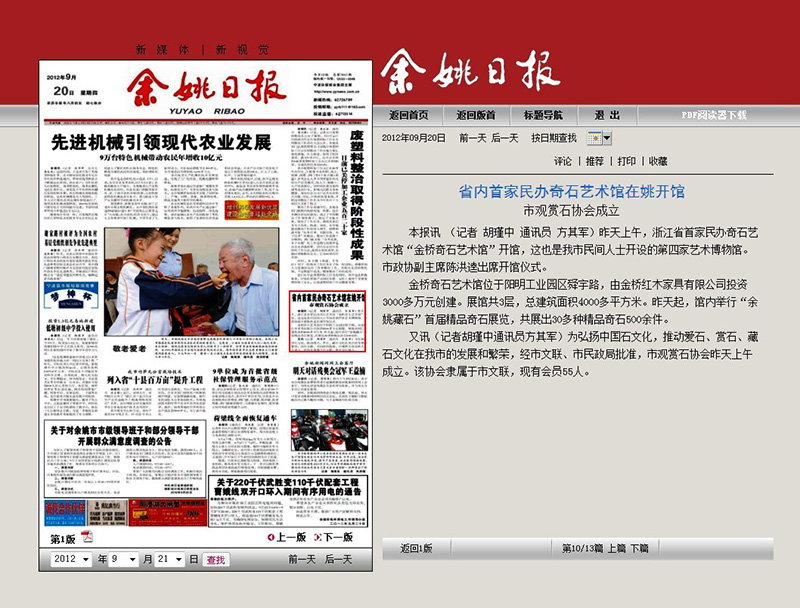 2012年9月19日,为弘扬中国石文化,推动爱石、赏石、藏石文化在我市的发展和繁荣,金桥奇石艺术馆作为浙江省首家民办奇石艺术馆在余姚举行了盛大的开馆仪式。